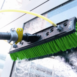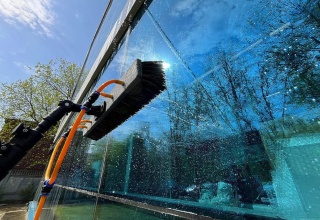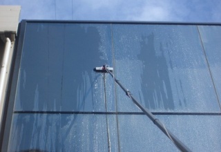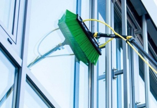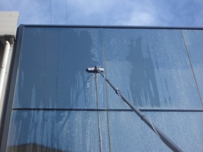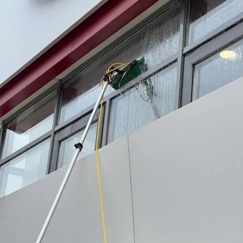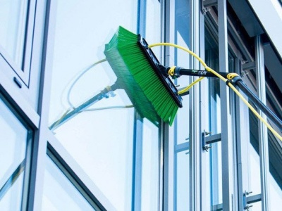 Очистка фасада и стёкол может происходить с подачей химии.